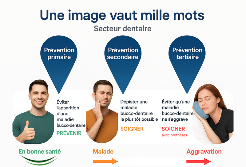 les trois catégories de prévention et leur articulation avec le parcours de soin, il est crucial de bien distinguer ces 3 niveaux préventifs, car les termes " promotion de la santé bucco-dentaire " et " prévention dentaire " sont souvent utilisés de manière interchangeable, à l’instar de " mutuelle " et " complémentaire santé ", alors qu'ils recouvrent des réalités bien différentes. Autrement dit, il ne faut pas confondre " les investissements préventifs " relevant du niveau primaire qui sont du domaine de la promotion de la santé bucco-dentaire, et " les dépenses préventives " relevant des niveaux secondaire et tertiaire qui sont du domaine des soins dentaires. En effet, la prévention primaire se concentre sur l’éducation et l’information, visant à éviter l’apparition des maladies bucco-dentaires (principalement :
